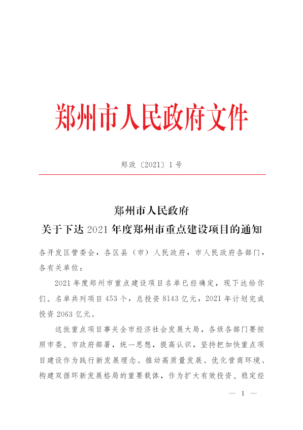 1月15日,鄭州市政府印發(fā)《2021年度鄭州市重點建設(shè)項目名單》,名單共列項目453個,總投資8143億元,2021年計劃完成投資2063億元。