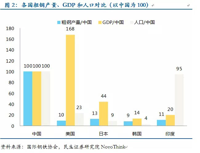 以典型的鋼鐵產(chǎn)業(yè)為例,2014年中國的粗鋼產(chǎn)量達到8億噸,幾乎占全球的一半。隨后的美國、日本、印度、韓國的粗鋼產(chǎn)量僅相當于中國的10%、13%、9%和11%,而這幾個國家的人口僅分別相當于中國的23%、9%、4%和95%,GDP卻相當于中國的168%、44%、14%和20%。換句話說,在同樣的人口和GDP水平下,中國的鋼鐵產(chǎn)量遠遠超過了國際平均水平,其中相當一部分就來自本該去掉的過剩產(chǎn)能。