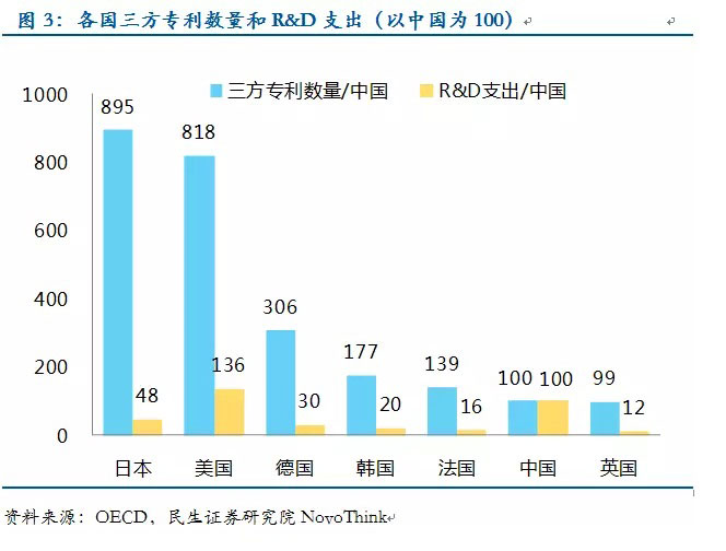 但事實上,中國只是一個有“數(shù)量”的創(chuàng)新大國,而并不是一個有“質(zhì)量”的創(chuàng)新強國。現(xiàn)在缺的不是“人”和“錢”,而是真正有價值的成果。國際上通常認為三方專利數(shù)能更準確的衡量一國的創(chuàng)新水平,而中國在這一指標上遠遠落后于主要發(fā)達國家。根據(jù)OECD的統(tǒng)計,中國的三方專利數(shù)量僅占全球的3.3%,日本美國德國韓國法國分別是我們的9倍、8.2倍、3.1倍、1.8倍和1.4倍,而他們所花的R&D支出僅相當于中國的48%、136%、30%、20%、16%。和我們專利數(shù)量差不多的是英國,而英國只有6000萬人口,R&D支出也僅相當于我們的12%。